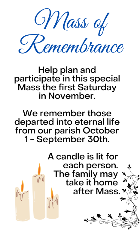 Each November, Christian Companions organize and host a Memorial Mass in which the faithful light candles for each parishioner buried from the parish that year. Candles are placed on the altar depicting the individual name of the departed and families can take their candle home following the mass, said longtime Christian Companions member Donna Klein. Members meet each October to finalize the Memorial Mass and send out sympathy cards and reminders for the special mass.