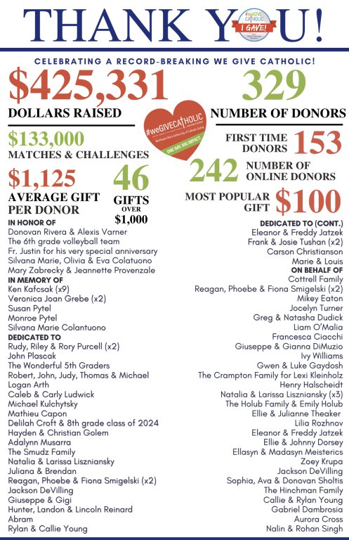 We are once again, thankful, grateful & blessed for the extraordinary results of this year's one day of online giving. We raised more than $425,000 through this year's campaign that will support the relocation and enclosure of the trash center; an upgraded teacher's lounge; refreshed church entrances; and operational support for the Academy.